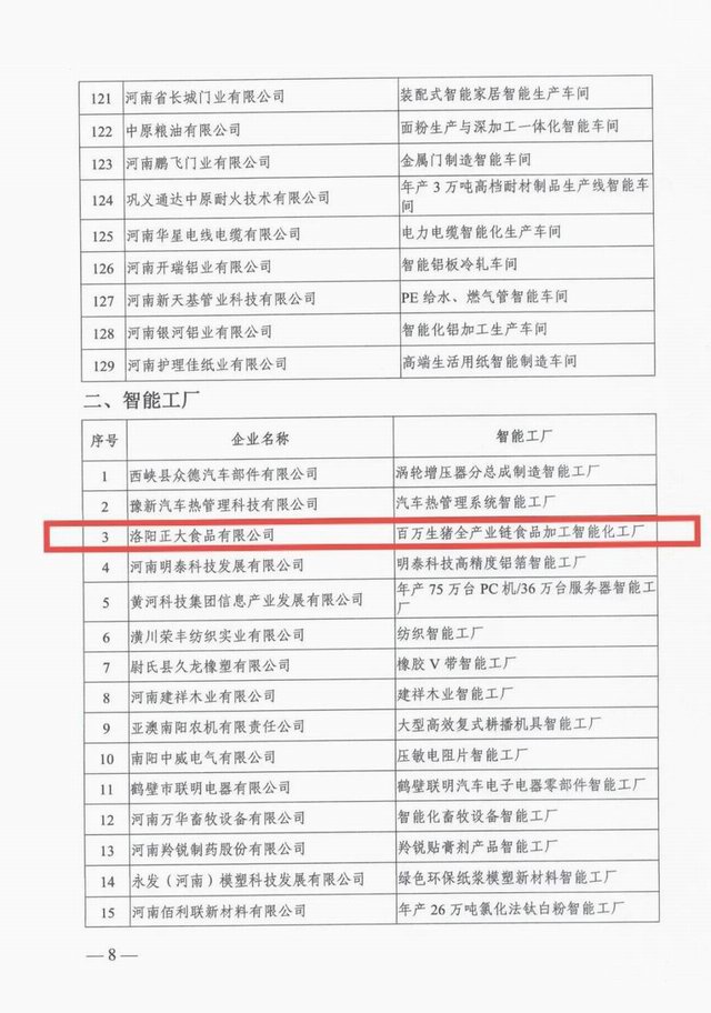 按照《河南省工業(yè)和信息化廳辦公室關(guān)于開(kāi)展2021年度河南省智能車(chē)間智能工廠(chǎng)申報工作的通知》(豫工信辦產(chǎn)融〔2021〕163號),經(jīng)企業(yè)志愿申報、各地工業(yè)和信息化主管部門(mén)初審和現場(chǎng)核查、省工業(yè)和信息化廳組織專(zhuān)家評審、網(wǎng)上公示,河南省工業(yè)和信息化廳確定129個(gè)智能車(chē)間為2021年河南省智能車(chē)間、34個(gè)智能工廠(chǎng)為2021年河南省智能工廠(chǎng)。2021年10月27日,河南省工業(yè)和信息化廳辦公室下發(fā)文件《河南省工業(yè)和信息化廳辦公室關(guān)于印發(fā)2021年河南省智能車(chē)間智能工廠(chǎng)名單的通知》(豫工信辦產(chǎn)融【2021】195號)予以公布。洛陽(yáng)正大獲評2021年河南省智能工廠(chǎng)!