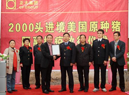 放行儀式上,陜西出入境檢驗檢疫局代表做了檢疫放行報告:“經(jīng)過(guò)3個(gè)多月的隔離檢驗,正大集團農牧食品企業(yè)(中國區)引進(jìn)的2000頭原種豬完全符合安全檢疫標準,準予放行?!标兾鞒鋈刖硻z驗檢疫局代表為正大集團陜西區陳強總裁頒發(fā)了《種豬檢疫合格證書(shū)》。