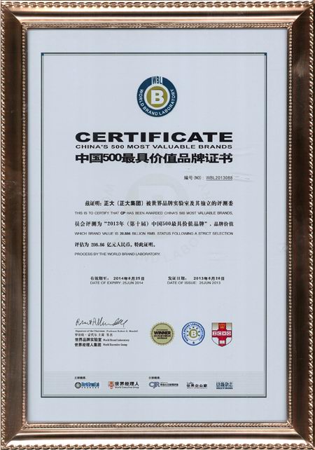 正大集團榮膺“中國500***具價(jià)值品牌”
