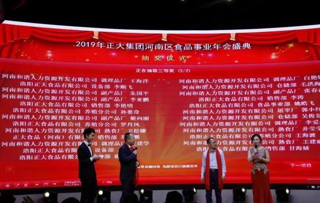 2019年1月21日,“龍頭騰起攬全月,鴻鵠展翅傲中原”——正大集團河南區食品事業(yè)2019新春年會(huì )在洛陽(yáng)東華大酒樓盛大召開(kāi)。正大集團農牧食品企業(yè)(中國)副董事長(cháng)王鴻章、正大集團河南區食品事業(yè)***總裁王學(xué)斌、正大集團河南區產(chǎn)業(yè)化總裁宋小兵及河南區食品事業(yè)各公司部門(mén)主管、員工代表300余人齊聚一堂,共享盛典。年會(huì )特邀河南東方正大有限公司洛陽(yáng)飼料廠(chǎng)董事長(cháng)茹懷智、中方副總經(jīng)理黃天發(fā)及河南和諧人力資源開(kāi)發(fā)有限公司董事、總經(jīng)理王縣委、副總經(jīng)理張麗云參加。