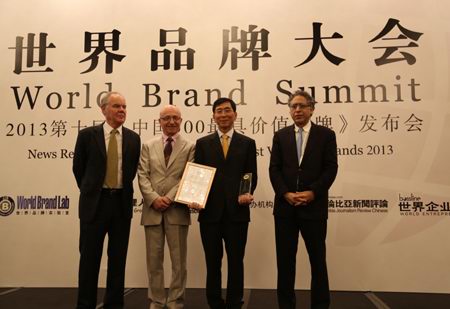 6月26日,由世界品牌實(shí)驗室、世界經(jīng)理人雜志等機構主辦的世界品牌大會(huì )暨2013年第十屆《中國500***具價(jià)值品牌》發(fā)布會(huì )在北京東方君悅大酒店召開(kāi)。會(huì )議發(fā)布了2013第十屆《中國500***具價(jià)值品牌》排行榜,正大集團以208.86億元的品牌價(jià)值位居第88位。美國耶魯大學(xué)管理學(xué)院萊維·多爾教授(右一)、法國歐洲工商管理學(xué)院瓊·克勞德·拉里齊教授(左二)以及英國牛津大學(xué)商學(xué)院斯蒂芬·沃格教授(左一)為正大集團頒獎。董事長(cháng)辦公室(北京)楊海浩總裁(右二)代表集團接受獎杯及證書(shū)。